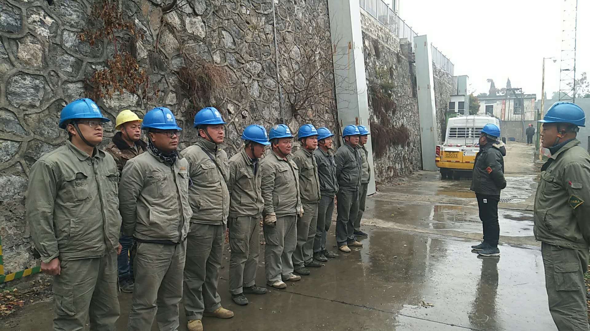 圖二:某變壓器增容改造項(xiàng)目現(xiàn)場,施工人員頂著寒風(fēng)、冒著冷雨召開班前會(huì)。